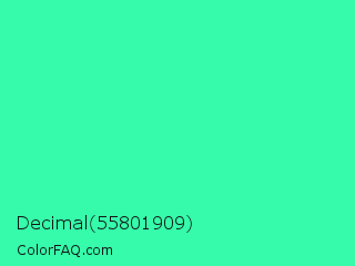 Decimal 55801909 Color is a normal green color and the nearest color is Eucalyptus #44d7a8. Hex code #35fbab and RGB value is rgb(53,251,171). In RGB color space, this color is composed of 21% red, 98% green, 67% blue, In CMYK color space, this color is composed of 79% cyan, 0% magenta, 32% yellow , 2% black , In HSL color space, this color has a hue angle of 156° , 96% saturation and 60% lightness.