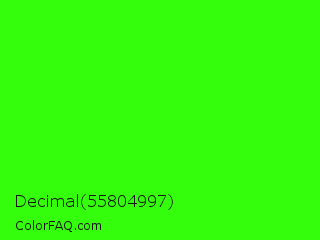 Decimal 55804997 Color is a normal green color and the nearest color is Neon Green #39ff14. Hex code #35fe0d and RGB value is rgb(53,254,13). In RGB color space, this color is composed of 21% red, 100% green, 5% blue, In CMYK color space, this color is composed of 79% cyan, 0% magenta, 95% yellow , 0% black , In HSL color space, this color has a hue angle of 110° , 99% saturation and 52% lightness.