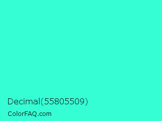 Decimal 55805509 Color is a normal cyan color and the nearest color is Turquoise #40e0d0. Hex code #35fed5 and RGB value is rgb(53,254,213). In RGB color space, this color is composed of 21% red, 100% green, 84% blue, In CMYK color space, this color is composed of 79% cyan, 0% magenta, 16% yellow , 0% black , In HSL color space, this color has a hue angle of 168° , 99% saturation and 60% lightness.