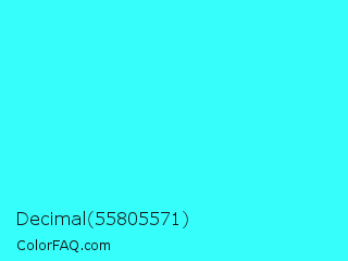 Decimal 55805571 Color is a normal cyan color and the nearest color is Loeen #15f2fd. Hex code #35fefb and RGB value is rgb(53,254,251). In RGB color space, this color is composed of 21% red, 100% green, 98% blue, In CMYK color space, this color is composed of 79% cyan, 0% magenta, 1% yellow , 0% black , In HSL color space, this color has a hue angle of 179° , 99% saturation and 60% lightness.