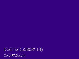 Decimal 55808114 Color is a dark violet color and the nearest color is Kingfisher Daisy #3e0480. Hex code #360080 and RGB value is rgb(54,0,128). In RGB color space, this color is composed of 21% red, 0% green, 50% blue, In CMYK color space, this color is composed of 58% cyan, 100% magenta, 0% yellow , 50% black , In HSL color space, this color has a hue angle of 265° , 100% saturation and 25% lightness.