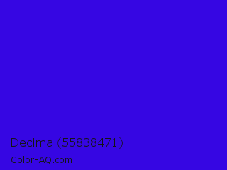 Decimal 55838471 Color is a normal indigo color and the nearest color is Interdimensional Blue #360ccc. Hex code #3606e3 and RGB value is rgb(54,6,227). In RGB color space, this color is composed of 21% red, 2% green, 89% blue, In CMYK color space, this color is composed of 76% cyan, 97% magenta, 0% yellow , 11% black , In HSL color space, this color has a hue angle of 253° , 95% saturation and 46% lightness.