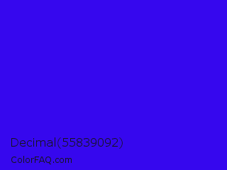 Decimal 55839092 Color is a normal indigo color and the nearest color is Electric Ultramarine #3f00ff. Hex code #3607ee and RGB value is rgb(54,7,238). In RGB color space, this color is composed of 21% red, 3% green, 93% blue, In CMYK color space, this color is composed of 77% cyan, 97% magenta, 0% yellow , 7% black , In HSL color space, this color has a hue angle of 252° , 94% saturation and 48% lightness.