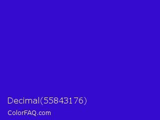 Decimal 55843176 Color is a normal indigo color and the nearest color is Interdimensional Blue #360ccc. Hex code #360bd0 and RGB value is rgb(54,11,208). In RGB color space, this color is composed of 21% red, 4% green, 82% blue, In CMYK color space, this color is composed of 74% cyan, 95% magenta, 0% yellow , 18% black , In HSL color space, this color has a hue angle of 253° , 90% saturation and 43% lightness.
