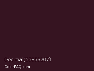 Decimal 55853207 Color is a very dark rose color and the nearest color is Tamarind #341515. Hex code #361421 and RGB value is rgb(54,20,33). In RGB color space, this color is composed of 21% red, 8% green, 13% blue, In CMYK color space, this color is composed of 0% cyan, 63% magenta, 39% yellow , 79% black , In HSL color space, this color has a hue angle of 337° , 46% saturation and 15% lightness.
