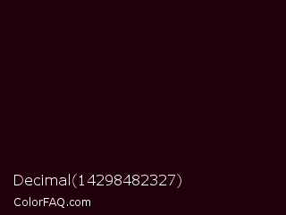 Decimal 14298482327 Color is a almost black rose color and the nearest color is Sepia Black #2b0202. Hex code #200009 and RGB value is rgb(32,0,9). In RGB color space, this color is composed of 13% red, 0% green, 4% blue, In CMYK color space, this color is composed of 0% cyan, 100% magenta, 72% yellow , 87% black , In HSL color space, this color has a hue angle of 343° , 100% saturation and 6% lightness.
