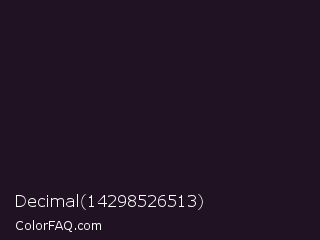 Decimal 14298526513 Color is a very dark purple color and the nearest color is Eerie Black #1b1b1b. Hex code #201223 and RGB value is rgb(32,18,35). In RGB color space, this color is composed of 13% red, 7% green, 14% blue, In CMYK color space, this color is composed of 9% cyan, 49% magenta, 0% yellow , 86% black , In HSL color space, this color has a hue angle of 289° , 32% saturation and 10% lightness.