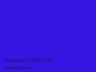 Decimal 55853712 Color is a normal indigo color and the nearest color is Interdimensional Blue #360ccc. Hex code #3614e2 and RGB value is rgb(54,20,226). In RGB color space, this color is composed of 21% red, 8% green, 89% blue, In CMYK color space, this color is composed of 76% cyan, 91% magenta, 0% yellow , 11% black , In HSL color space, this color has a hue angle of 250° , 84% saturation and 48% lightness.