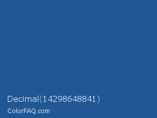 Decimal 14298648841 Color is a normal blue color and the nearest color is Cyan Cobalt Blue #28589c. Hex code #205795 and RGB value is rgb(32,87,149). In RGB color space, this color is composed of 13% red, 34% green, 58% blue, In CMYK color space, this color is composed of 79% cyan, 42% magenta, 0% yellow , 42% black , In HSL color space, this color has a hue angle of 212° , 65% saturation and 35% lightness.