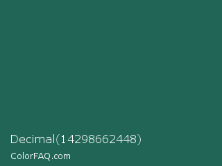 Decimal 14298662448 Color is a dark cyan color and the nearest color is Spectra #2f5a57. Hex code #206556 and RGB value is rgb(32,101,86). In RGB color space, this color is composed of 13% red, 40% green, 34% blue, In CMYK color space, this color is composed of 68% cyan, 0% magenta, 15% yellow , 60% black , In HSL color space, this color has a hue angle of 167° , 52% saturation and 26% lightness.