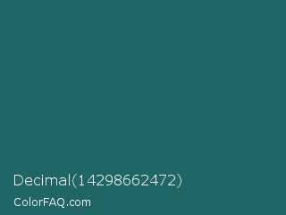 Decimal 14298662472 Color is a dark cyan color and the nearest color is Casal #2f6168. Hex code #206568 and RGB value is rgb(32,101,104). In RGB color space, this color is composed of 13% red, 40% green, 41% blue, In CMYK color space, this color is composed of 69% cyan, 3% magenta, 0% yellow , 59% black , In HSL color space, this color has a hue angle of 183° , 53% saturation and 27% lightness.