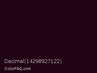 Decimal 14298927122 Color is a almost black magenta color and the nearest color is Night Rider #1f120f. Hex code #210314 and RGB value is rgb(33,3,20). In RGB color space, this color is composed of 13% red, 1% green, 8% blue, In CMYK color space, this color is composed of 0% cyan, 91% magenta, 39% yellow , 87% black , In HSL color space, this color has a hue angle of 326° , 83% saturation and 7% lightness.
