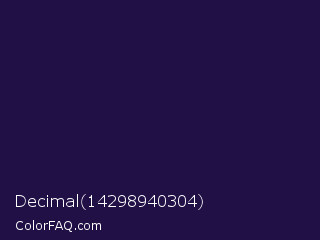 Decimal 14298940304 Color is a very dark indigo color and the nearest color is Violet #240a40. Hex code #211046 and RGB value is rgb(33,16,70). In RGB color space, this color is composed of 13% red, 6% green, 27% blue, In CMYK color space, this color is composed of 53% cyan, 77% magenta, 0% yellow , 73% black , In HSL color space, this color has a hue angle of 259° , 63% saturation and 17% lightness.