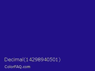 Decimal 14298940501 Color is a dark indigo color and the nearest color is Blue Gem #2c0e8c. Hex code #211087 and RGB value is rgb(33,16,135). In RGB color space, this color is composed of 13% red, 6% green, 53% blue, In CMYK color space, this color is composed of 76% cyan, 88% magenta, 0% yellow , 47% black , In HSL color space, this color has a hue angle of 249° , 79% saturation and 30% lightness.