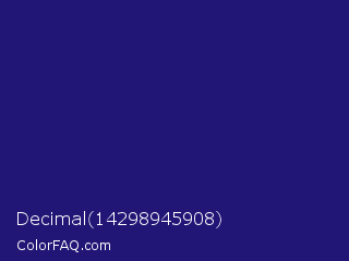 Decimal 14298945908 Color is a dark indigo color and the nearest color is Deep Koamaru #1b127b. Hex code #211676 and RGB value is rgb(33,22,118). In RGB color space, this color is composed of 13% red, 9% green, 46% blue, In CMYK color space, this color is composed of 72% cyan, 81% magenta, 0% yellow , 54% black , In HSL color space, this color has a hue angle of 247° , 69% saturation and 27% lightness.