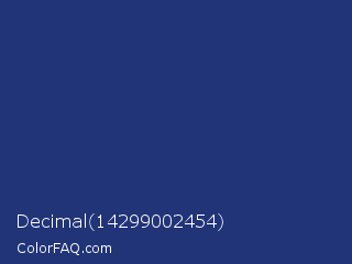 Decimal 14299002454 Color is a dark blue color and the nearest color is Astronaut #283a77. Hex code #213478 and RGB value is rgb(33,52,120). In RGB color space, this color is composed of 13% red, 20% green, 47% blue, In CMYK color space, this color is composed of 73% cyan, 57% magenta, 0% yellow , 53% black , In HSL color space, this color has a hue angle of 227° , 57% saturation and 30% lightness.