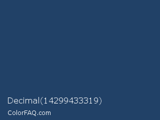 Decimal 14299433319 Color is a dark blue color and the nearest color is Rhino #2e3f62. Hex code #214167 and RGB value is rgb(33,65,103). In RGB color space, this color is composed of 13% red, 25% green, 40% blue, In CMYK color space, this color is composed of 68% cyan, 37% magenta, 0% yellow , 60% black , In HSL color space, this color has a hue angle of 213° , 51% saturation and 27% lightness.