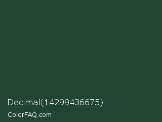 Decimal 14299436675 Color is a very dark green color and the nearest color is Everglade #1c402e. Hex code #214433 and RGB value is rgb(33,68,51). In RGB color space, this color is composed of 13% red, 27% green, 20% blue, In CMYK color space, this color is composed of 51% cyan, 0% magenta, 25% yellow , 73% black , In HSL color space, this color has a hue angle of 151° , 35% saturation and 20% lightness.