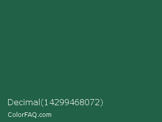 Decimal 14299468072 Color is a dark green color and the nearest color is Green Pea #1d6142. Hex code #216148 and RGB value is rgb(33,97,72). In RGB color space, this color is composed of 13% red, 38% green, 28% blue, In CMYK color space, this color is composed of 66% cyan, 0% magenta, 26% yellow , 62% black , In HSL color space, this color has a hue angle of 157° , 49% saturation and 25% lightness.
