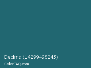 Decimal 14299498245 Color is a dark cyan color and the nearest color is Casal #2f6168. Hex code #216771 and RGB value is rgb(33,103,113). In RGB color space, this color is composed of 13% red, 40% green, 44% blue, In CMYK color space, this color is composed of 71% cyan, 9% magenta, 0% yellow , 56% black , In HSL color space, this color has a hue angle of 188° , 55% saturation and 29% lightness.