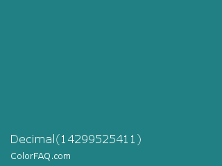 Decimal 14299525411 Color is a normal cyan color and the nearest color is Elm #1c7c7d. Hex code #218083 and RGB value is rgb(33,128,131). In RGB color space, this color is composed of 13% red, 50% green, 51% blue, In CMYK color space, this color is composed of 75% cyan, 2% magenta, 0% yellow , 49% black , In HSL color space, this color has a hue angle of 182° , 60% saturation and 32% lightness.