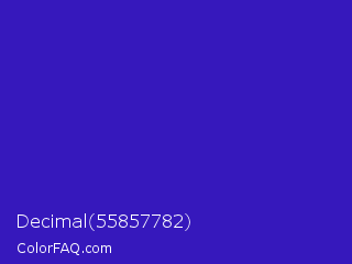 Decimal 55857782 Color is a normal indigo color and the nearest color is Interdimensional Blue #360ccc. Hex code #3618bc and RGB value is rgb(54,24,188). In RGB color space, this color is composed of 21% red, 9% green, 74% blue, In CMYK color space, this color is composed of 71% cyan, 87% magenta, 0% yellow , 26% black , In HSL color space, this color has a hue angle of 251° , 77% saturation and 42% lightness.
