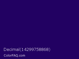 Decimal 14299758868 Color is a very dark indigo color and the nearest color is Paua #260368. Hex code #220162 and RGB value is rgb(34,1,98). In RGB color space, this color is composed of 13% red, 0% green, 38% blue, In CMYK color space, this color is composed of 65% cyan, 99% magenta, 0% yellow , 62% black , In HSL color space, this color has a hue angle of 260° , 98% saturation and 19% lightness.