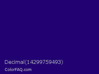 Decimal 14299759493 Color is a dark indigo color and the nearest color is Paris M #26056a. Hex code #220271 and RGB value is rgb(34,2,113). In RGB color space, this color is composed of 13% red, 1% green, 44% blue, In CMYK color space, this color is composed of 70% cyan, 98% magenta, 0% yellow , 56% black , In HSL color space, this color has a hue angle of 257° , 97% saturation and 23% lightness.