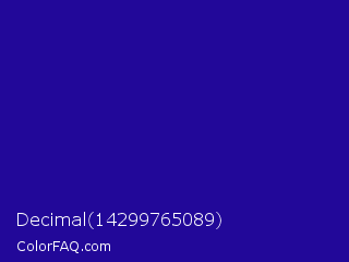 Decimal 14299765089 Color is a normal indigo color and the nearest color is Blue Gem #2c0e8c. Hex code #220899 and RGB value is rgb(34,8,153). In RGB color space, this color is composed of 13% red, 3% green, 60% blue, In CMYK color space, this color is composed of 78% cyan, 95% magenta, 0% yellow , 40% black , In HSL color space, this color has a hue angle of 251° , 90% saturation and 32% lightness.