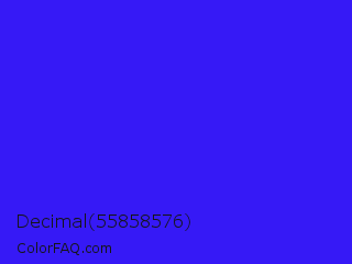 Decimal 55858576 Color is a normal indigo color and the nearest color is Bluebonnet #1c1cf0. Hex code #3619f6 and RGB value is rgb(54,25,246). In RGB color space, this color is composed of 21% red, 10% green, 96% blue, In CMYK color space, this color is composed of 78% cyan, 90% magenta, 0% yellow , 4% black , In HSL color space, this color has a hue angle of 248° , 92% saturation and 53% lightness.