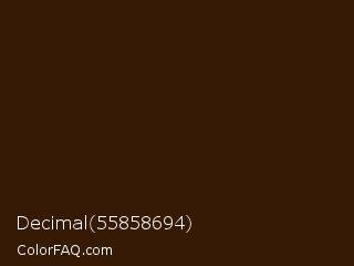 Decimal 55858694 Color is a very dark orange color and the nearest color is Clinker #371d09. Hex code #361a06 and RGB value is rgb(54,26,6). In RGB color space, this color is composed of 21% red, 10% green, 2% blue, In CMYK color space, this color is composed of 0% cyan, 52% magenta, 89% yellow , 79% black , In HSL color space, this color has a hue angle of 25° , 80% saturation and 12% lightness.