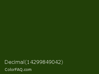 Decimal 14299849042 Color is a very dark green color and the nearest color is Turtle Green #2a380b. Hex code #224008 and RGB value is rgb(34,64,8). In RGB color space, this color is composed of 13% red, 25% green, 3% blue, In CMYK color space, this color is composed of 47% cyan, 0% magenta, 88% yellow , 75% black , In HSL color space, this color has a hue angle of 92° , 78% saturation and 14% lightness.