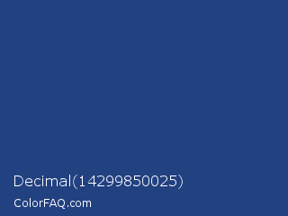 Decimal 14299850025 Color is a normal blue color and the nearest color is Bay Of Many #273a81. Hex code #224181 and RGB value is rgb(34,65,129). In RGB color space, this color is composed of 13% red, 25% green, 51% blue, In CMYK color space, this color is composed of 74% cyan, 50% magenta, 0% yellow , 49% black , In HSL color space, this color has a hue angle of 220° , 58% saturation and 32% lightness.