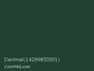 Decimal 14299850501 Color is a very dark green color and the nearest color is Everglade #1c402e. Hex code #224231 and RGB value is rgb(34,66,49). In RGB color space, this color is composed of 13% red, 26% green, 19% blue, In CMYK color space, this color is composed of 48% cyan, 0% magenta, 26% yellow , 74% black , In HSL color space, this color has a hue angle of 148° , 32% saturation and 20% lightness.