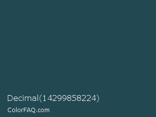 Decimal 14299858224 Color is a dark cyan color and the nearest color is Blue Dianne #204852. Hex code #224952 and RGB value is rgb(34,73,82). In RGB color space, this color is composed of 13% red, 29% green, 32% blue, In CMYK color space, this color is composed of 59% cyan, 11% magenta, 0% yellow , 68% black , In HSL color space, this color has a hue angle of 191° , 41% saturation and 23% lightness.