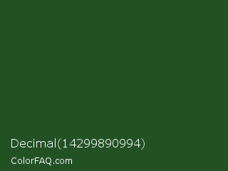 Decimal 14299890994 Color is a dark green color and the nearest color is Cal Poly Pomona Green #1e4d2b. Hex code #225124 and RGB value is rgb(34,81,36). In RGB color space, this color is composed of 13% red, 32% green, 14% blue, In CMYK color space, this color is composed of 58% cyan, 0% magenta, 56% yellow , 68% black , In HSL color space, this color has a hue angle of 123° , 41% saturation and 23% lightness.
