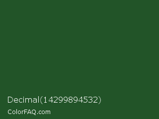 Decimal 14299894532 Color is a dark green color and the nearest color is Cal Poly Pomona Green #1e4d2b. Hex code #225428 and RGB value is rgb(34,84,40). In RGB color space, this color is composed of 13% red, 33% green, 16% blue, In CMYK color space, this color is composed of 60% cyan, 0% magenta, 52% yellow , 67% black , In HSL color space, this color has a hue angle of 127° , 42% saturation and 23% lightness.