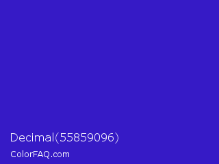 Decimal 55859096 Color is a normal indigo color and the nearest color is Interdimensional Blue #360ccc. Hex code #361ac6 and RGB value is rgb(54,26,198). In RGB color space, this color is composed of 21% red, 10% green, 78% blue, In CMYK color space, this color is composed of 73% cyan, 87% magenta, 0% yellow , 22% black , In HSL color space, this color has a hue angle of 250° , 77% saturation and 44% lightness.