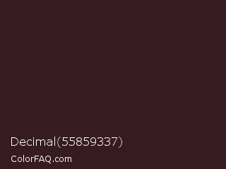 Decimal 55859337 Color is a very dark red color and the nearest color is Jon #3b1f1f. Hex code #361b21 and RGB value is rgb(54,27,33). In RGB color space, this color is composed of 21% red, 11% green, 13% blue, In CMYK color space, this color is composed of 0% cyan, 50% magenta, 39% yellow , 79% black , In HSL color space, this color has a hue angle of 347° , 33% saturation and 16% lightness.