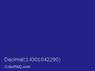 Decimal 14301042290 Color is a normal indigo color and the nearest color is Jacksons Purple #20208d. Hex code #242288 and RGB value is rgb(36,34,136). In RGB color space, this color is composed of 14% red, 13% green, 53% blue, In CMYK color space, this color is composed of 74% cyan, 75% magenta, 0% yellow , 47% black , In HSL color space, this color has a hue angle of 241° , 60% saturation and 33% lightness.