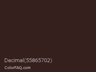Decimal 55865702 Color is a very dark red color and the nearest color is Jon #3b1f1f. Hex code #36201e and RGB value is rgb(54,32,30). In RGB color space, this color is composed of 21% red, 13% green, 12% blue, In CMYK color space, this color is composed of 0% cyan, 41% magenta, 44% yellow , 79% black , In HSL color space, this color has a hue angle of 5° , 29% saturation and 16% lightness.