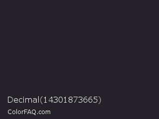 Decimal 14301873665 Color is a very dark purple color and the nearest color is Raisin Black #242124. Hex code #252029 and RGB value is rgb(37,32,41). In RGB color space, this color is composed of 15% red, 13% green, 16% blue, In CMYK color space, this color is composed of 10% cyan, 22% magenta, 0% yellow , 84% black , In HSL color space, this color has a hue angle of 273° , 12% saturation and 14% lightness.