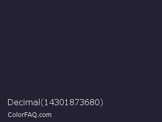 Decimal 14301873680 Color is a very dark indigo color and the nearest color is Steel Gray #262335. Hex code #252032 and RGB value is rgb(37,32,50). In RGB color space, this color is composed of 15% red, 13% green, 20% blue, In CMYK color space, this color is composed of 26% cyan, 36% magenta, 0% yellow , 80% black , In HSL color space, this color has a hue angle of 257° , 22% saturation and 16% lightness.