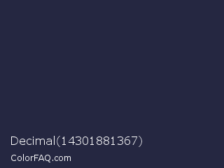 Decimal 14301881367 Color is a very dark blue color and the nearest color is Ebony Clay #26283b. Hex code #252741 and RGB value is rgb(37,39,65). In RGB color space, this color is composed of 15% red, 15% green, 25% blue, In CMYK color space, this color is composed of 43% cyan, 40% magenta, 0% yellow , 75% black , In HSL color space, this color has a hue angle of 236° , 27% saturation and 20% lightness.