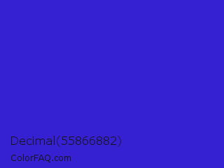 Decimal 55866882 Color is a normal indigo color and the nearest color is Interdimensional Blue #360ccc. Hex code #3621d2 and RGB value is rgb(54,33,210). In RGB color space, this color is composed of 21% red, 13% green, 82% blue, In CMYK color space, this color is composed of 74% cyan, 84% magenta, 0% yellow , 18% black , In HSL color space, this color has a hue angle of 247° , 73% saturation and 48% lightness.