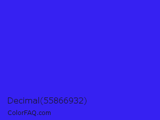 Decimal 55866932 Color is a normal indigo color and the nearest color is Bluebonnet #1c1cf0. Hex code #3621f2 and RGB value is rgb(54,33,242). In RGB color space, this color is composed of 21% red, 13% green, 95% blue, In CMYK color space, this color is composed of 78% cyan, 86% magenta, 0% yellow , 5% black , In HSL color space, this color has a hue angle of 246° , 89% saturation and 54% lightness.
