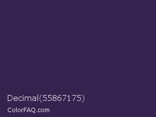 Decimal 55867175 Color is a very dark violet color and the nearest color is Deep Grape #381a51. Hex code #36224f and RGB value is rgb(54,34,79). In RGB color space, this color is composed of 21% red, 13% green, 31% blue, In CMYK color space, this color is composed of 32% cyan, 57% magenta, 0% yellow , 69% black , In HSL color space, this color has a hue angle of 267° , 40% saturation and 22% lightness.
