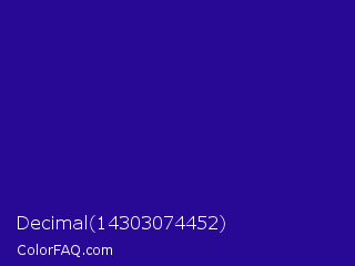 Decimal 14303074452 Color is a normal indigo color and the nearest color is Blue Gem #2c0e8c. Hex code #270996 and RGB value is rgb(39,9,150). In RGB color space, this color is composed of 15% red, 4% green, 59% blue, In CMYK color space, this color is composed of 74% cyan, 94% magenta, 0% yellow , 41% black , In HSL color space, this color has a hue angle of 253° , 89% saturation and 31% lightness.