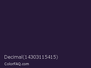 Decimal 14303115415 Color is a very dark violet color and the nearest color is Revolver #2c1632. Hex code #271939 and RGB value is rgb(39,25,57). In RGB color space, this color is composed of 15% red, 10% green, 22% blue, In CMYK color space, this color is composed of 32% cyan, 56% magenta, 0% yellow , 78% black , In HSL color space, this color has a hue angle of 266° , 39% saturation and 16% lightness.
