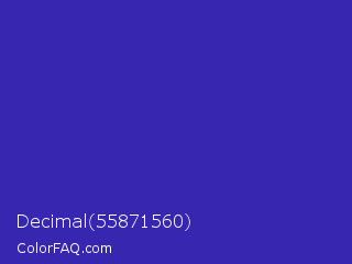 Decimal 55871560 Color is a normal indigo color and the nearest color is Governor Bay #2f3cb3. Hex code #3626b0 and RGB value is rgb(54,38,176). In RGB color space, this color is composed of 21% red, 15% green, 69% blue, In CMYK color space, this color is composed of 69% cyan, 78% magenta, 0% yellow , 31% black , In HSL color space, this color has a hue angle of 247° , 64% saturation and 42% lightness.